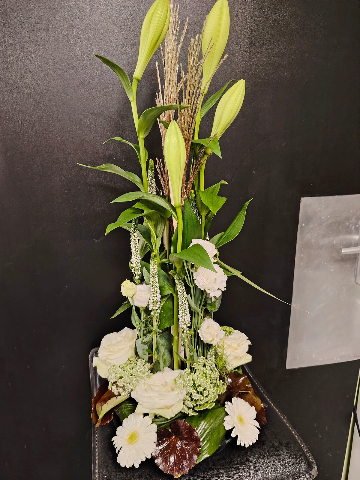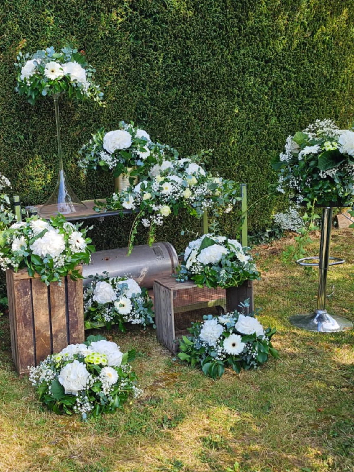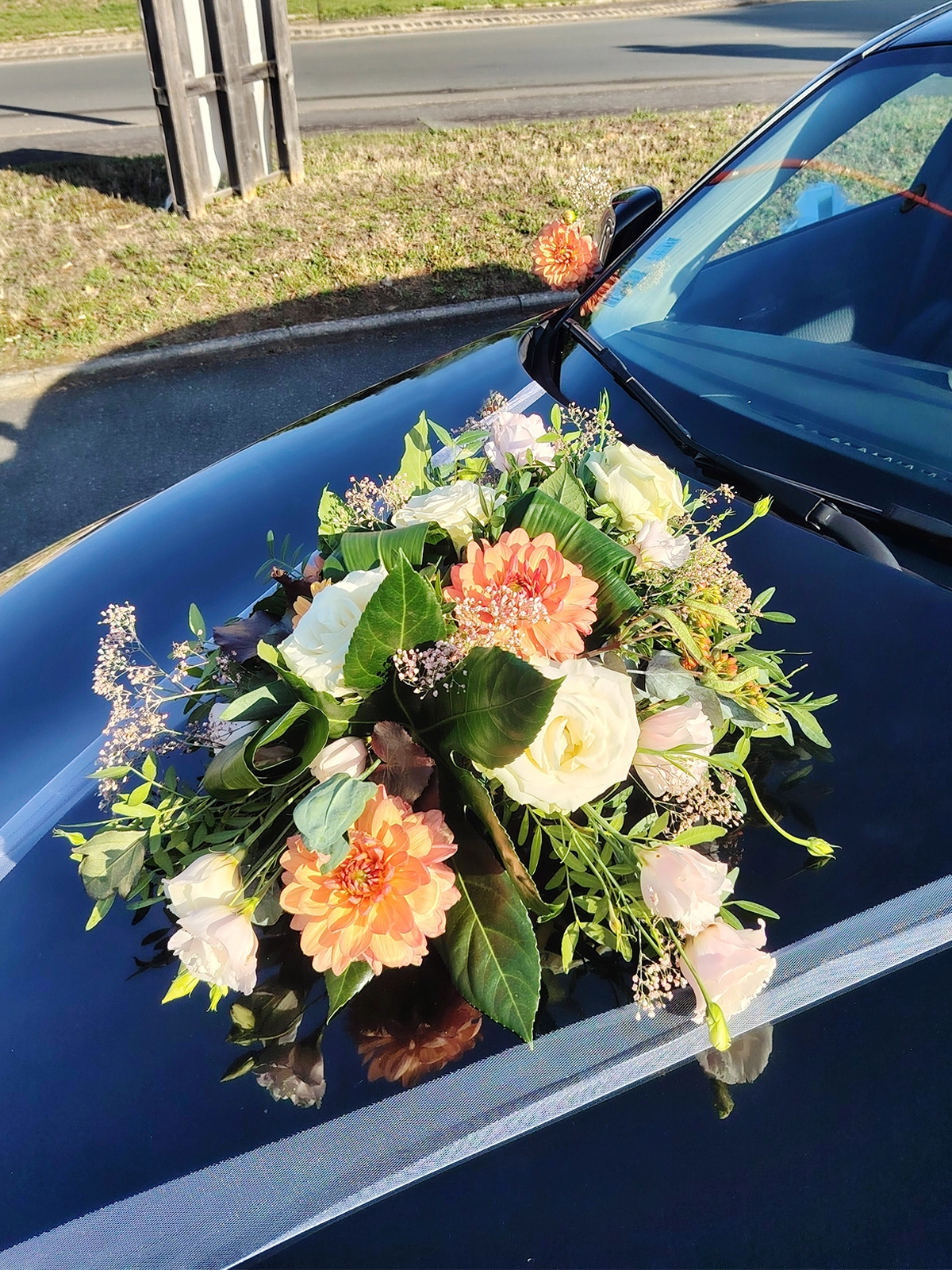 Nous nous adaptons à vos envies : compositions sur sellette, bancs d’église, présentation sur buffets, couronnes fleuries, banquets élaborés, décoration de voiture entière, etc.
